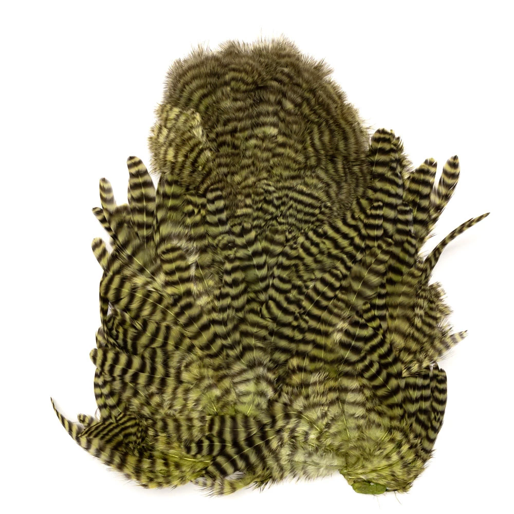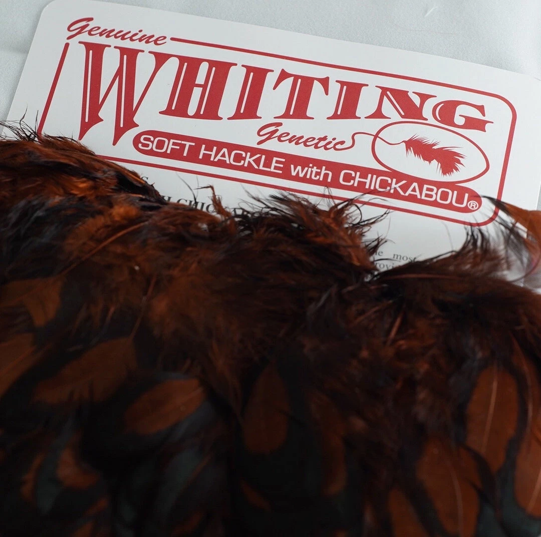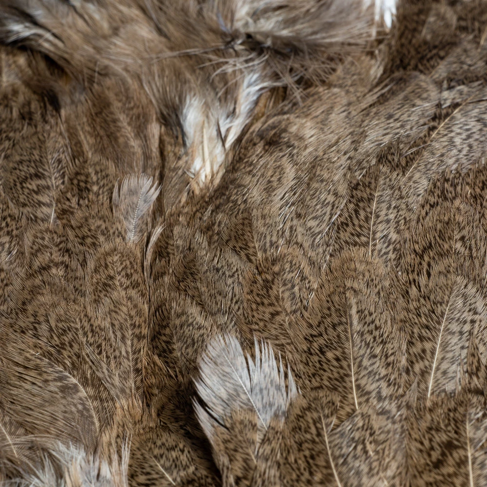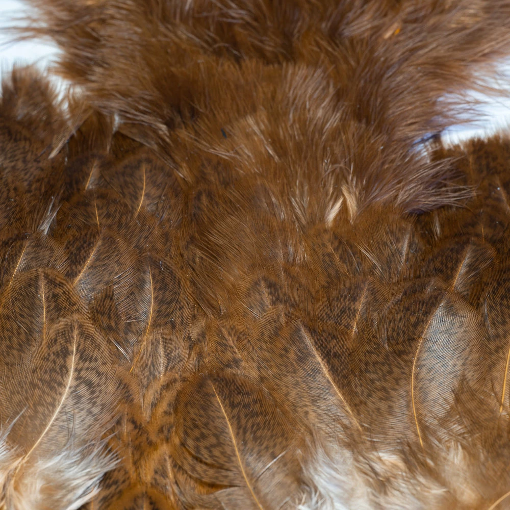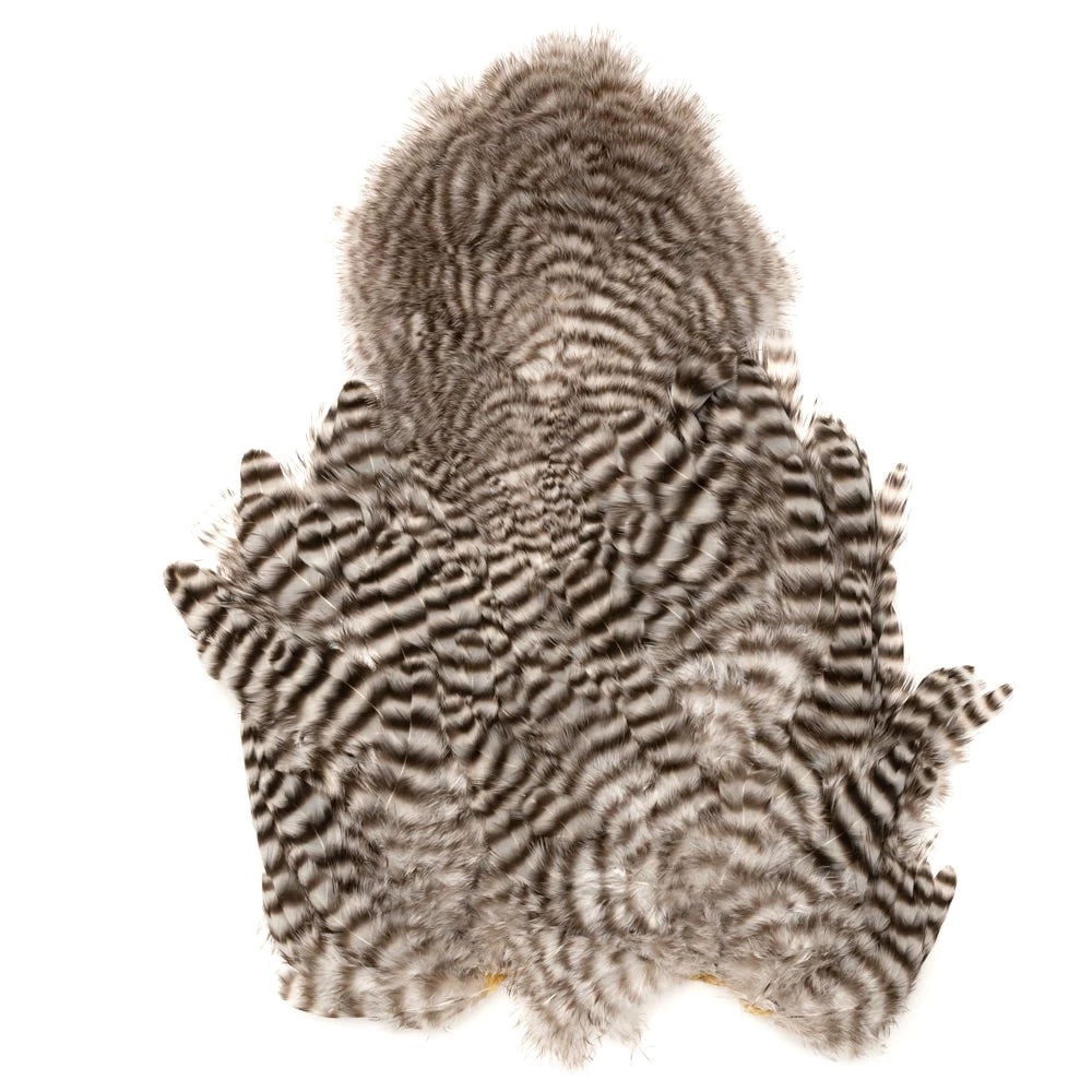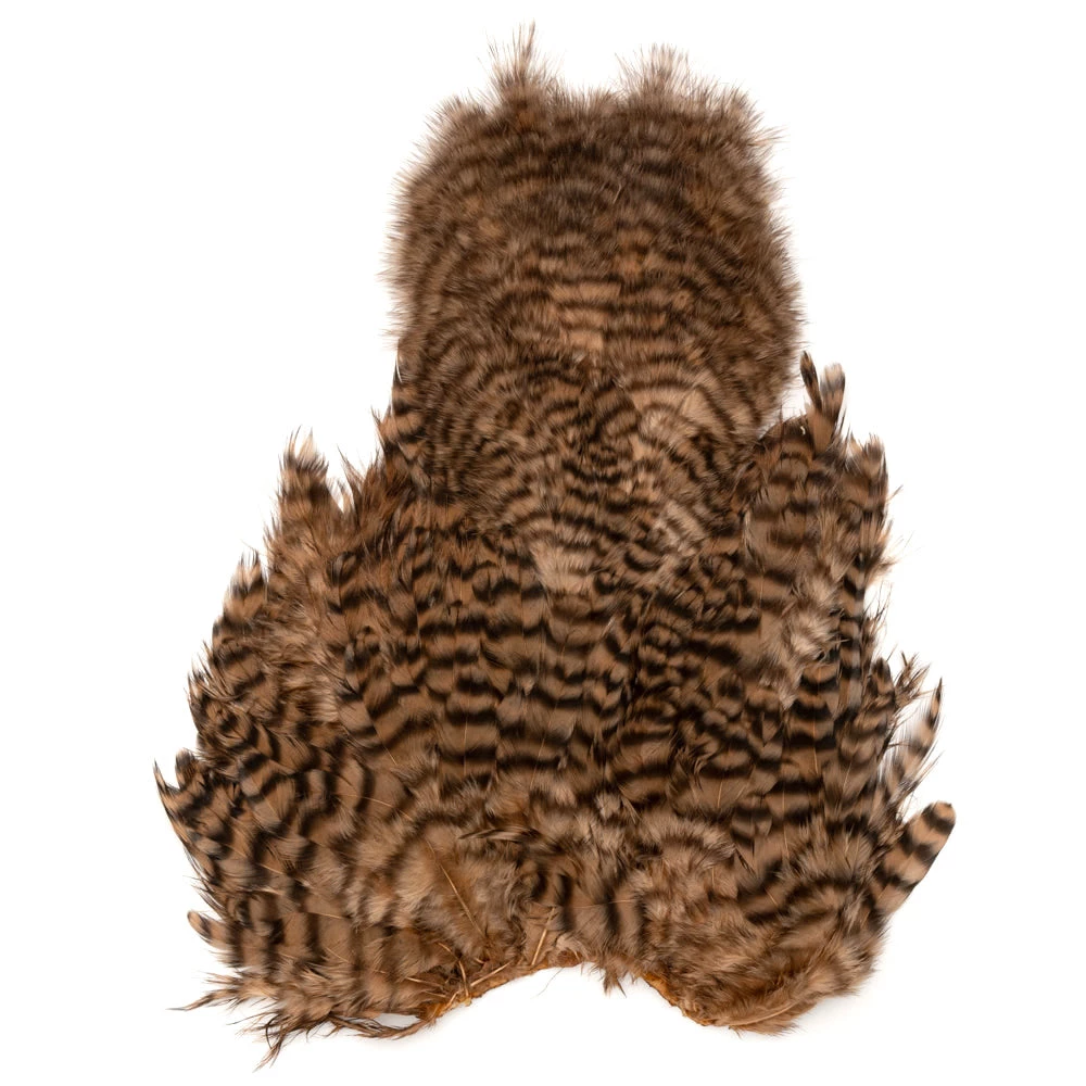 Two very unique feathers in 1 pelt. The first feather, the soft hackle, is a wide, webby, soft feather great for large collars on salmon, steelhead, bass, and saltwater flies. The second feather, the chickabou is a smaller marabou. Much finer than turkey marabou, the chickabou is excellent for small streamers, leech patterns, dragonfly, and damselfly nymphs.