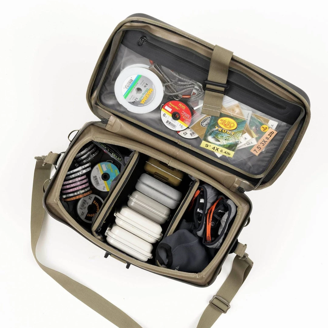 The rugged, water-resistant Dry Creek Boat Bag tames tackle and solves chaos with a worry-free one hand-operated latch system for quick access to structured internals that divide fly boxes, leaders, tippets, tools and everything you need within easy reach.
